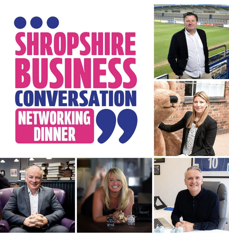 The lineup for Shropshire Business Conversation dinner includes Charlie Blakemore - CEO of Intercity Technology, Deborah Mitchell - founder of Heaven Skincare, Sarah Holmes - managing director of Merrythought, Will Stratton-Morris - former CEO of Caffè Nero and now group chief business development officer, and Walter Gleeson - co-founder of Music Magpie.