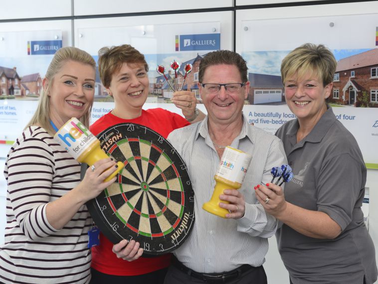 Pictured from left: Lynsey Kilvert, Hope House area fund raiser, darts competition organiser Sue Lane, Galliers’ sales and marketing director Andy Gough and Di Peatroy of Galliers Homes.
